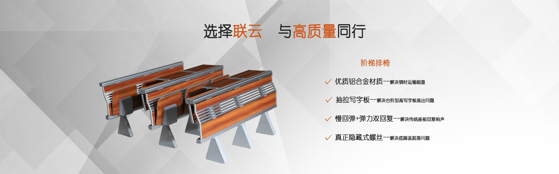 佛山聯云是廣東一家專業生產禮堂椅、階梯排椅、課桌椅、等候椅的廠家。產品符合人體工學原理的坐墊、靠背、扶手,環保優質的表面織物和舒適柔軟的填充物質,日臻純青的制作工藝,兼顧唯美造型與多樣化實用功能,聯云對每一個細節都努力用心,只為給你創造超越身心的完美體驗。